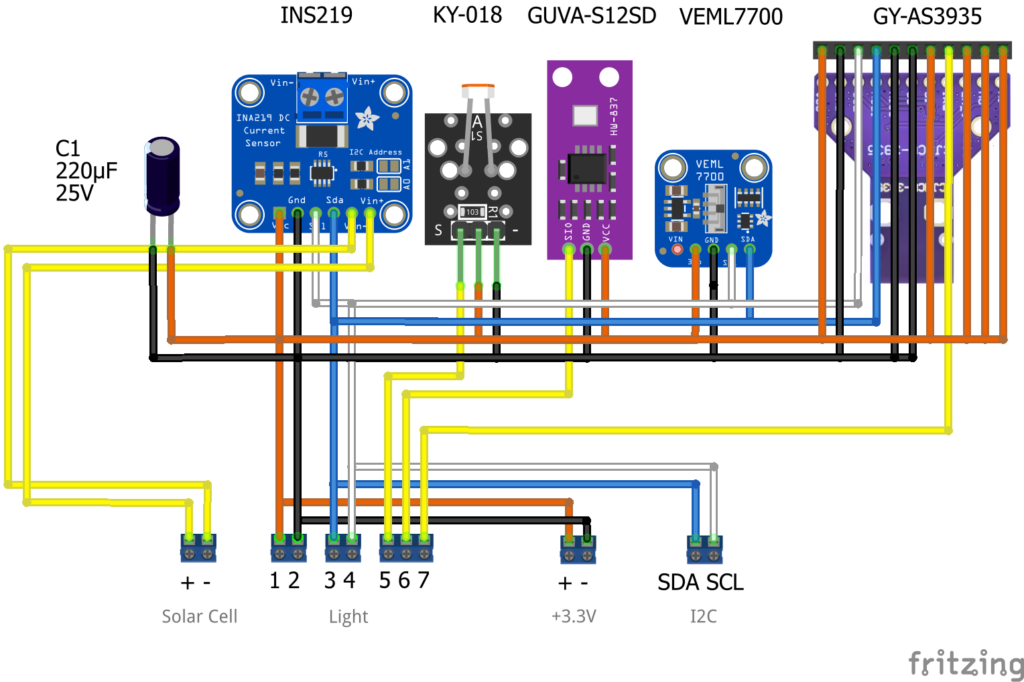 Mit dem mitgelieferten Kabel oder mit eventuell vorhandenen Jumperkabeln wird die Solarsensor-Platine provisorisch an die Platine der Steuerungseinheit angeschlossen. Dabei werden die Klemmen mit der Bezeichnung „Light 1“ bis „Light 7“ an der Platine des Solar-Sensors mit den Klemmen „Light 1“ bis „Light 7“ auf der Platine der Steuerungseinheit 1:1 verbunden. Hinweis: Die Klemmen mit der Bezeichnung „3.3V“ und „I2C“ sind für spätere Erweiterungen und müssen nicht angeschlossen werden. Auch die Klemmen mit der Bezeichnung „Cell +/-“ werden aktuell noch nicht angeschlossen. Nun wird die Steuerungseinheit wieder mit Strom versorgt. Nach dem Booten kann man sich per Webbrowser auf der Oberfläche der Wetterstation einloggen. Man wechselt auf den Tab Devices und schaut unter Nr.10 nach, ob bei raw_twilight sowie raw_uvi eine Spannung angezeigt wird (durch Abdecken der Sensoren kann man testen, ob sich die Spannungen verändern). Unter Nr. 11, Nr. 12 und Nr. 9 (Blitzsensor) müssen die die Sensoren aktiviert („Enabled“) sein und auch Messwerte anzeigen. Alternativ kann man den I2C Bus nach den Sensoren scannen, in dem man unter Tools –> I2C Scan schaut, ob ein VEML7700 und ein INA219 (sowie ggf. ein AS3935) angezeigt werden.