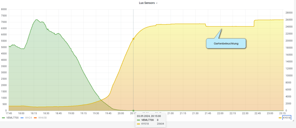 Möchte man die Außenbeleuchtung sehr exakt im Dämmerungsbereich steuern, empfiehlt sich zusätzlich zum Helligkeitssensor noch ein Dämmerungssensor, der sehr viel empfindlicher im Dämmerungsbereich reagiert. Dazu hat die WeatherLox Wetterstation noch eine hochempfindliche Photodiode verbaut. Der Dämmerungssensor gibt keine absolute Helligkeit in Lux aus. Er gibt lediglich eine Spannung aus, die eine Messgröße für die Dämmerung ist. Wir rechnen diesen Wert in „Prozent Dämmerung“ um, wobei 100% absolute Dunkelheit bedeutet. Vergleicht man den Dämmerungssensor mit dem verbauten Helligkeitssensor, so erkennt man, dass der Dämmerungssensor die Dämmerung noch deutlich länger auflösen kann als der Helligkeitssensor. Dieser springt ab einer gewissen Dämmerung auf „0 Lux“, während der Dämmerungssensor noch weiter nach unten auflösen kann. Man erkennt bei mir sogar die geschaltete Gartenbeleuchtung, die lediglich aus indirekt beleuchteten Pflanzen besteht!