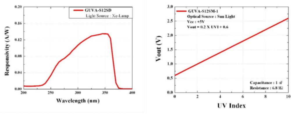 Die WeatherLox Wetterstation verwendet den UV-Sensor GUVA S12S, den es von verschiedenen Herstellern gibt. Der Sensor misst im relevanten Wellenlängenbereich der UVA- und UVB-Strahlung (280 – 400 nm), die Ausgabe des Sensors ist linear zum UV-Index.