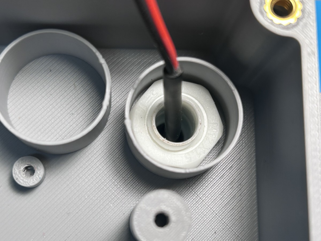 Nun wird die Kabeldurchführung und das Entlüftungsventil handfest in die Bohrungen auf der Gehäuseunterseite eingeschraubt. Das Kabel wird nun 10 cm abisoliert und anschließend durch die Kabeldurchführung in das Gehäuse eingeführt. Es wird soweit durchgeschoben, dass der Kabelmantel ca. 2 mm über dem Vergussring heraussteht.
