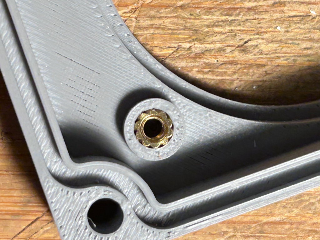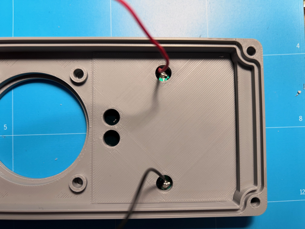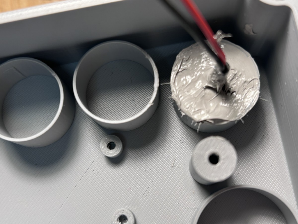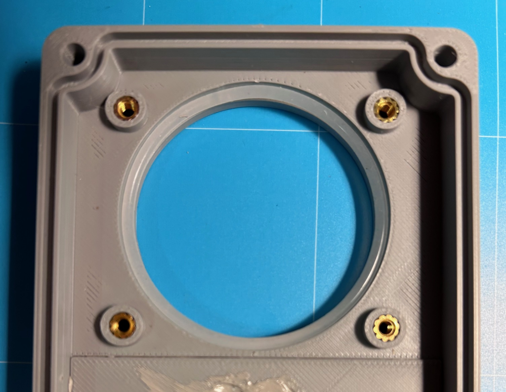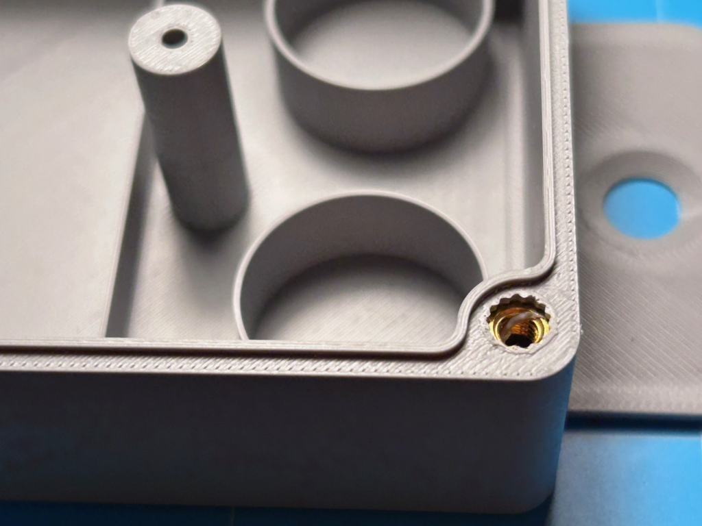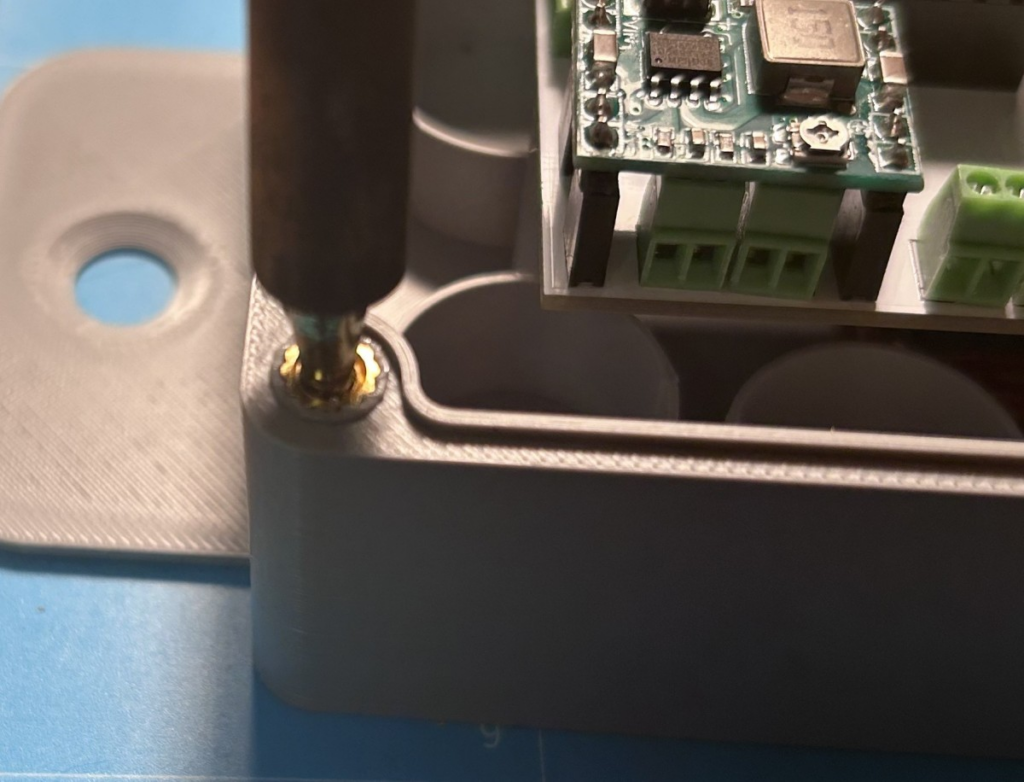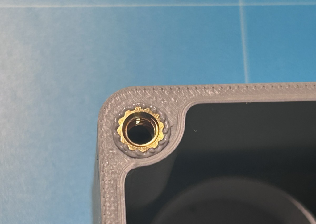 Als nächstes werden die vier M4 Messing Einpressmuttern / Gewindeeinsätze in das Gehäuseunterteil eingeschmolzen. Das wird mit dem Lötkolben gemacht. Dazu wird der Lötkolben auf maximale Temperatur vorgeheizt. Nun dreht man eine der M4 Schrauben in den Gewindeeinsatz leicht ein und setzt ihn damit gerade auf die vorgefertigte Bohrung des Gehäuseunterteils auf. Einer der gezackten Ränder des Messingeinsatzes sollte dabei oben sein. Sitzt die Einpressmutter gerade, wird die Schraube wieder entfernt. Nun wird der Lötkolben mit der Spitze vorsichtig in den Gewindeeinsatz gedrückt. Dieser erwärmt sich sofort und schmilzt den umliegenden Kunststoff an. Mit leichtem Druck kann man nun die Hülse in das Material drücken, die Hülse wird ca. 1 mm unter die Oberkante am Gehäuse gedrückt. Das wiederholt man bei alles 4 Gewindeeinsätzen.