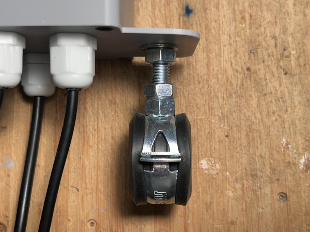 Mit den Rohrschellen wird das Gehäuse nun am Halterungssystem montiert. Dazu werden die beiden M8x20mm Senkkopfschrauben von oben in die seitlichen Halter eingebracht. Von unten folgt eine Unterlegscheibe gefolgt von einer M8 Mutter, mit der die Schraube zunächst handfest angezogen wird. Anschließend schraubt man die Rohrschelle fest von unten an die Schraube an. Nun die Schraube drehen, bis die passende Position erreicht ist und dann die Mutter fest anziehen.