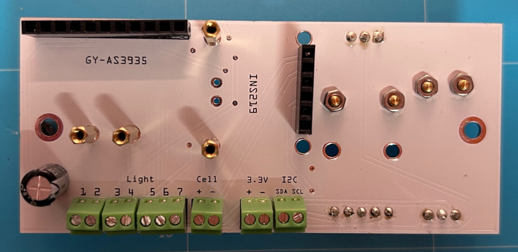 Jetzt muss die Lötarbeit getestet werden! Das ist sehr wichtig, da die nachfolgenden Schritte (Aufbringen des Schutzlackes) nicht mehr rückgängig gemacht werden können! Dazu wird die Steuerungseinheit vom Strom getrennt. Alle Sensoren (INA219, KY-018, GUVA-S12SD und VEML7700) werden in ihre jeweiligen Buchsenleisten auf der Solar Sensor Platine gesetzt. Sollte auch das Blitzmodul mit verbaut werden, kann dieses nun ebenfalls auf seinen Sockelplatz gesetzt werden. Die vollständig bestückte Platine sieht so aus: