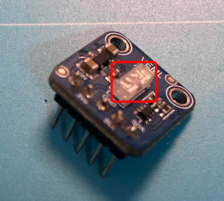 Nun wird der Platinen-Schutzlack auf alle Platinen – also die Platinen der Sensormodule und auf die Platine des Solar Sensor Moduls – aufgebracht. Die Platinen werden mit dem Schutzlack auf beiden Seiten bestrichen – dabei aber natürlich alle Kontaktstifte auslassen! Der Lack ist sehr flüssig und lässt sich sehr gut mit einem Wattestäbchen auftragen, in dem man einen Tropfen aufbringt und diesen leicht verstreicht. Diesen Vorgang wiederholt man, bis die gesamte Platine ausreichend mit Lack bedeckt ist. Aber ACHTUNG! Auf gar keinen Fall darf Lack auf den eigentlichen Sensor (siehe rote Umrandungen auf den Bildern unten) aufgebracht werden! Lackiert man die lichtempfindlichen Teile der Sensoren, sind diese kaputt! Nachdem der Lack aufgebracht ist, sind Lötarbeiten nicht mehr möglich!