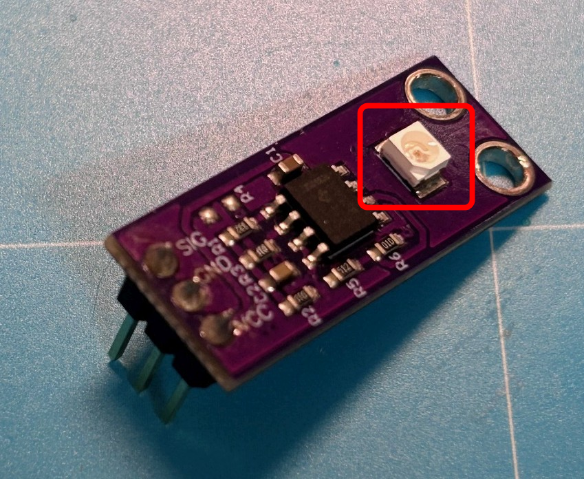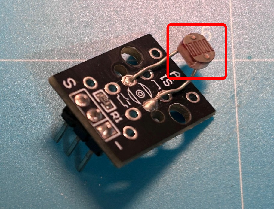 Das KY-018 kommt mit einer bereits vorinstallierten Stiftleiste, die aber leider so nicht verwendet werden kann. Sie wird daher noch einmal ausgelötet: Dazu werden alle 3 Lötpunkte gleichzeitig mit dem Lötkolben erhitzt und die Stiftleiste dann mit einer Zange von der anderen Seite herausgezogen. Anschließend wird eine gerade 3er Stiftleiste auf der Unterseite des Moduls eingelötet. Der lichtempfindliche Sensor wird mit einer Zange noch vorsichtig zurechtgebogen, so dass er an der Oberseite der Platine sitzt und nach oben zeigt.