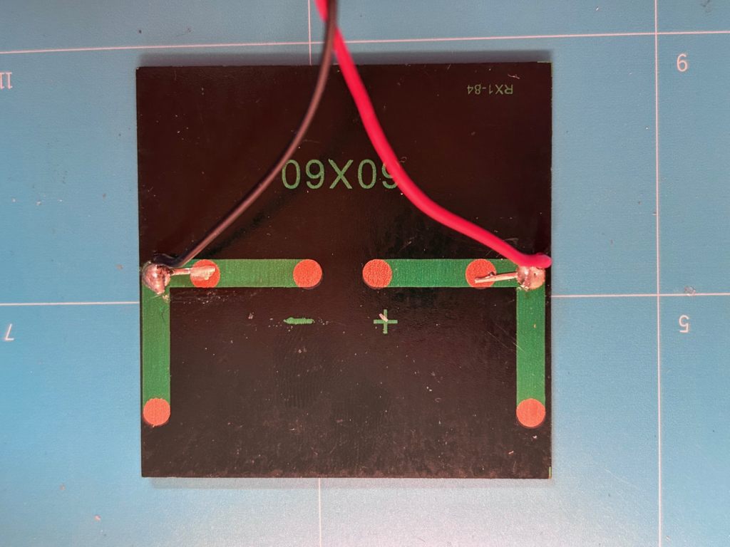 Weiter geht es mit der Vorbereitung der Solarzelle für den Strahlungssensor. Hier gibt es verschiedene Bauarten, bei denen sich die Lötpunkte an unterschiedlichen Stellen befinden können. Am einfachsten ist es dort anzulöten, wo sich bereits Lötzinn auf der Solarzelle befindet. Oft ist das mittig-außen. Dazu nimmt man ca. 10-15cm des 7-adrigen Kabels, isoliert dieses ab und nutzt die rote (Plus) und schwarze (Minus) Ader. Diese werden an den Enden abisoliert und die Enden an der Solarzelle verlötet. Des muss darauf geachtet werden, dass nicht zu viel Lötzinn verwendet wird, sonst passen die Bohrungen im Gehäuseadapter später nicht (siehe weiter unten).