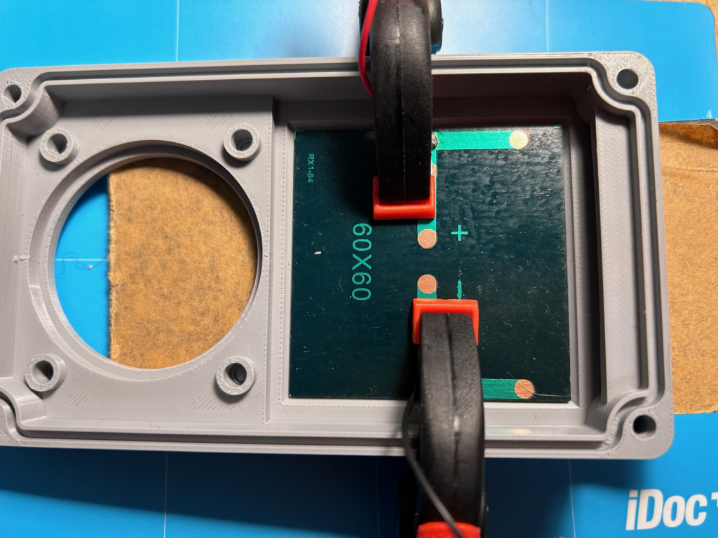 Passt alles zusammen, wird die Adapterplatte wieder entfernt. Die Solarzelle wird nun im Gehäuse verklebt. Dazu setzt man sie ein und spannt sie mit zwei Mini-Federklemmen fest auf Position ein. Dazu ein kleines Stück Holz, Lineal oder was man so da hat von unten als Gegenstück verwenden.