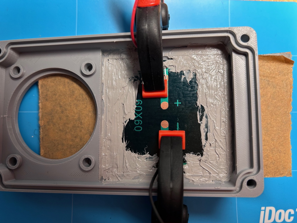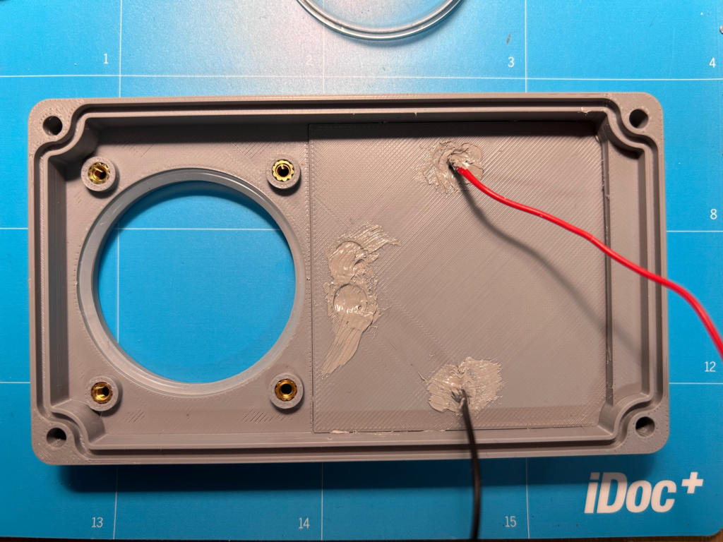 Nun werden die Bohrungen noch mit Kleber verschlossen und dann der Kleber vollständig getrocknet (1 Tag). Weiterhin NICHT von unten an der Solarzelle drücken! Die Adapterplatte ist noch nicht vollständig gesichert und es besteht weiterhin die Gefahr, dass man Solarzelle und Adapterplatte aus dem Gehäuse drückt!