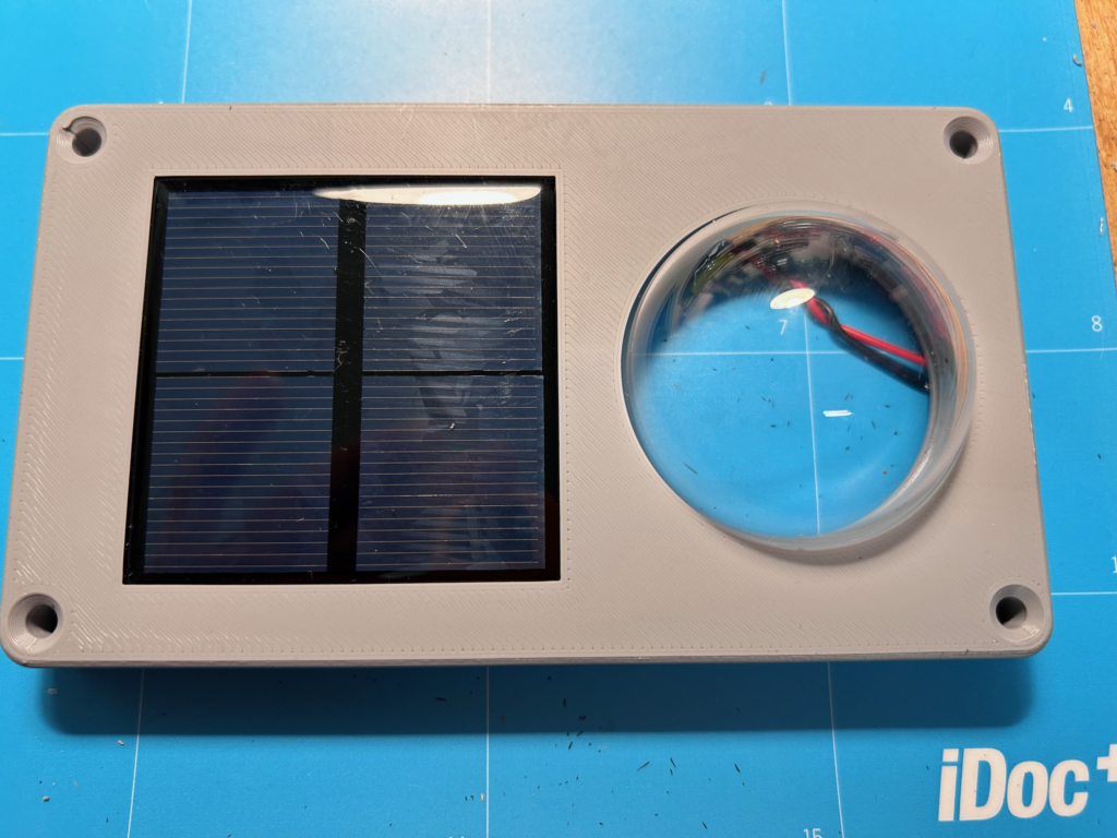 Anschließend wird die Plexiglaskuppel von unten in den Gehäusedeckel (ohne Gewalt!) gedrückt, die Adapterplatte für die Kuppel eingesetzt und mit den beiliegenden 4 Senkkopfschrauben M3x5mm am Gehäusedeckel verschraubt. Die angeschraubte Adapterplatte für die Kuppel dichtet zum einen die Kuppel gegen das Gehäuse ab und sichert zum anderen auch die Adapterplatte der Solarzelle gegen versehentliches Herausdrücken.