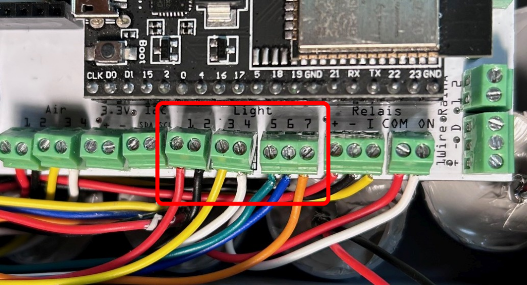 Das 7-adrige Kabel zur Steuerung wird an die Klemmen mit der Bezeichnung Light 1 bis Light 7 angeschlossen: