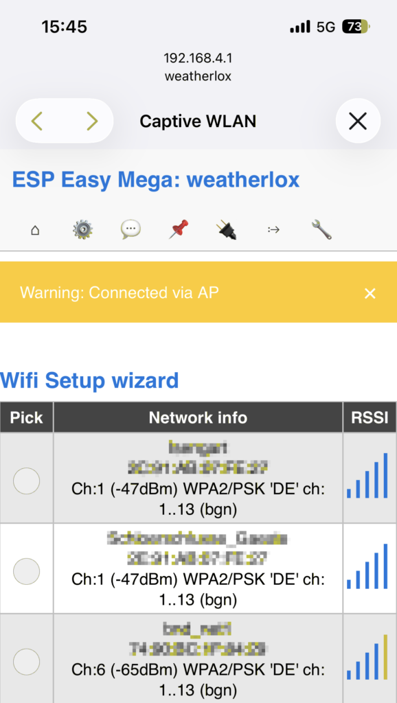 Nun wird die gesamte Platine inklusive der Zusatzmodule erstmals mit Spannung versorgt. Der ESP baut einen eigenen WLAN-Hotspot weatherlox auf, auf dem man sich nun mit dem Handy verbindet. Das Passwort für den Hotspot lautet ebenfalls weatherlox