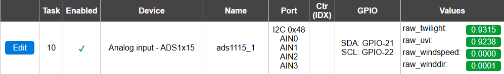 Um zu kontrollieren, ob der ADS1115 Sensor korrekt funktioniert, wechselt man nun auf den Tab Devices und schaut unter Task 10 nach, ob der Sensor aktiviert („Enabled“) ist und auch Messwerte anzeigt. Alternativ kann man den I2C Bus nach dem Sensor scannen, in dem man unter Tools –> I2C Scan schaut, ob ein „Analog input – ADS1x15“ unter der Adresse 0x48 gefunden wird.