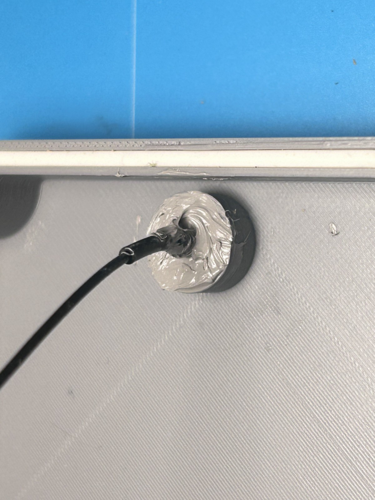 Nun wird die Kabeldurchführung fixiert und anschließend alle Kabeldurchführungen mit dem Sikaflex 522 grau Dicht- und Klebstoff aufgefüllt. Hierbei kann man direkt die Klebepistole verwenden. Man füllt zunächst die eigentliche Kabeldurchführung mit Dichtstoff auf, biegt dabei das Kabel etwas von links nach rechts, damit die gesamte Kabeldurchführung mit Dichtstoff aufgefüllt wird. Anschließend wird der Vergussring noch komplett mit Dichtstoff aufgefüllt und dann mit dem Spatel glatt verstrichen.