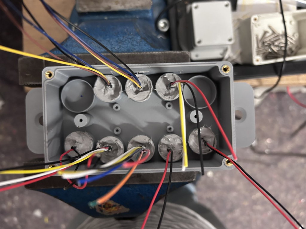 Sind alle Bohrungen eingebracht, werden die Kabeldurchführungen handfest eingeschraubt. Jedes Kabel wird nun 10 cm abisoliert und anschließend durch die Kabeldurchführung in das Gehäuse eingeführt. Es wird soweit durchgeschoben, dass der Kabelmantel ca. 2 mm über dem Vergussring heraussteht.