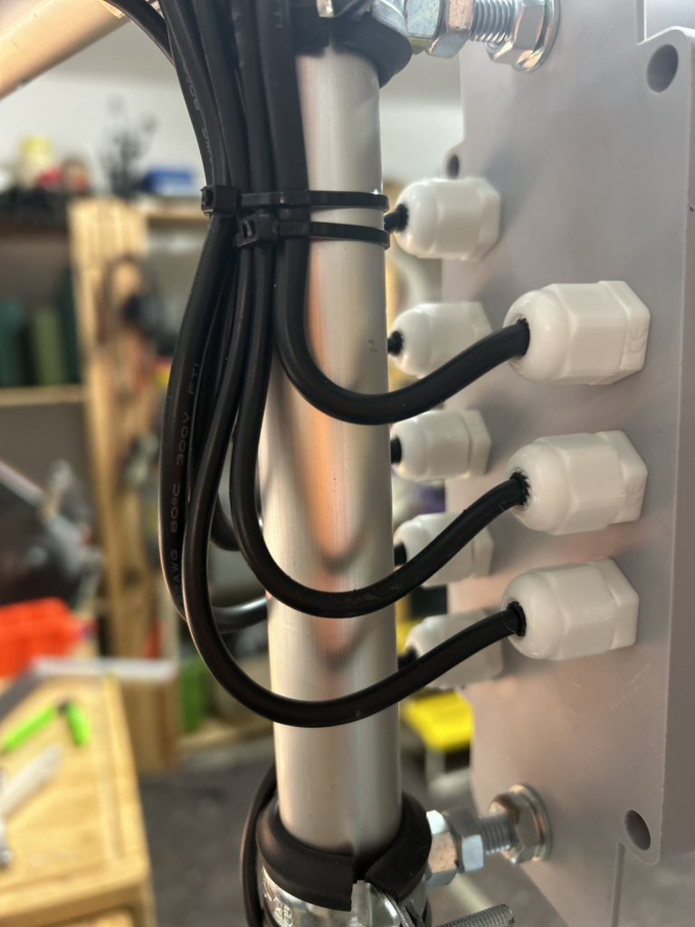 Die restlichen Kabel werden am Halterungssystem so mit den Kabelbindern gesichert, dass sie einen Bogen nach unten beschreiben, bevor sie nach oben geführt werden. So ist sichergestellt, dass das Regenwasser, welches sich an den Kabeln sammeln kann, von den Kabeldurchführungen weg und damit auch vom Gehäuse weggeleitet wird.